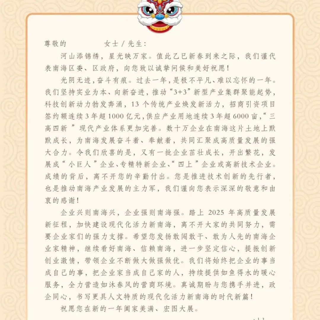 政企同心向未来!南海区委区政府向企业家发出新春慰问信