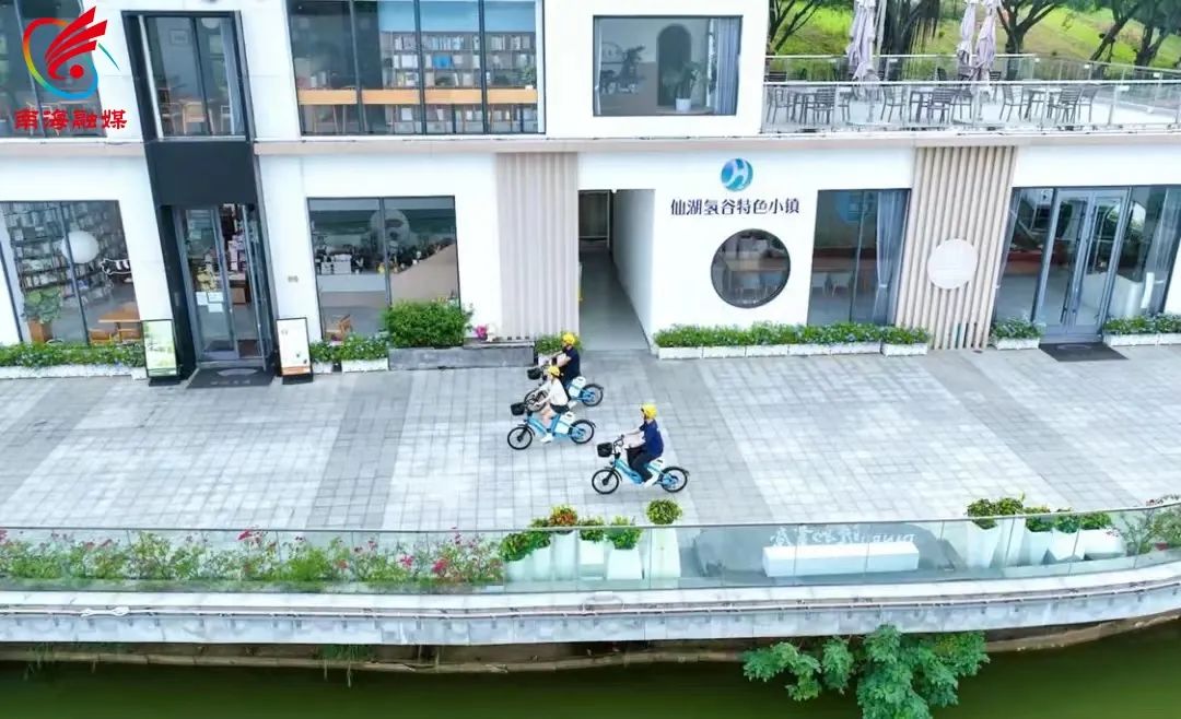 ▲ 在丹灶仙湖,不少游客骑着白蓝相间的氢能两轮助力车穿行其中。